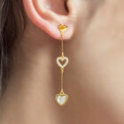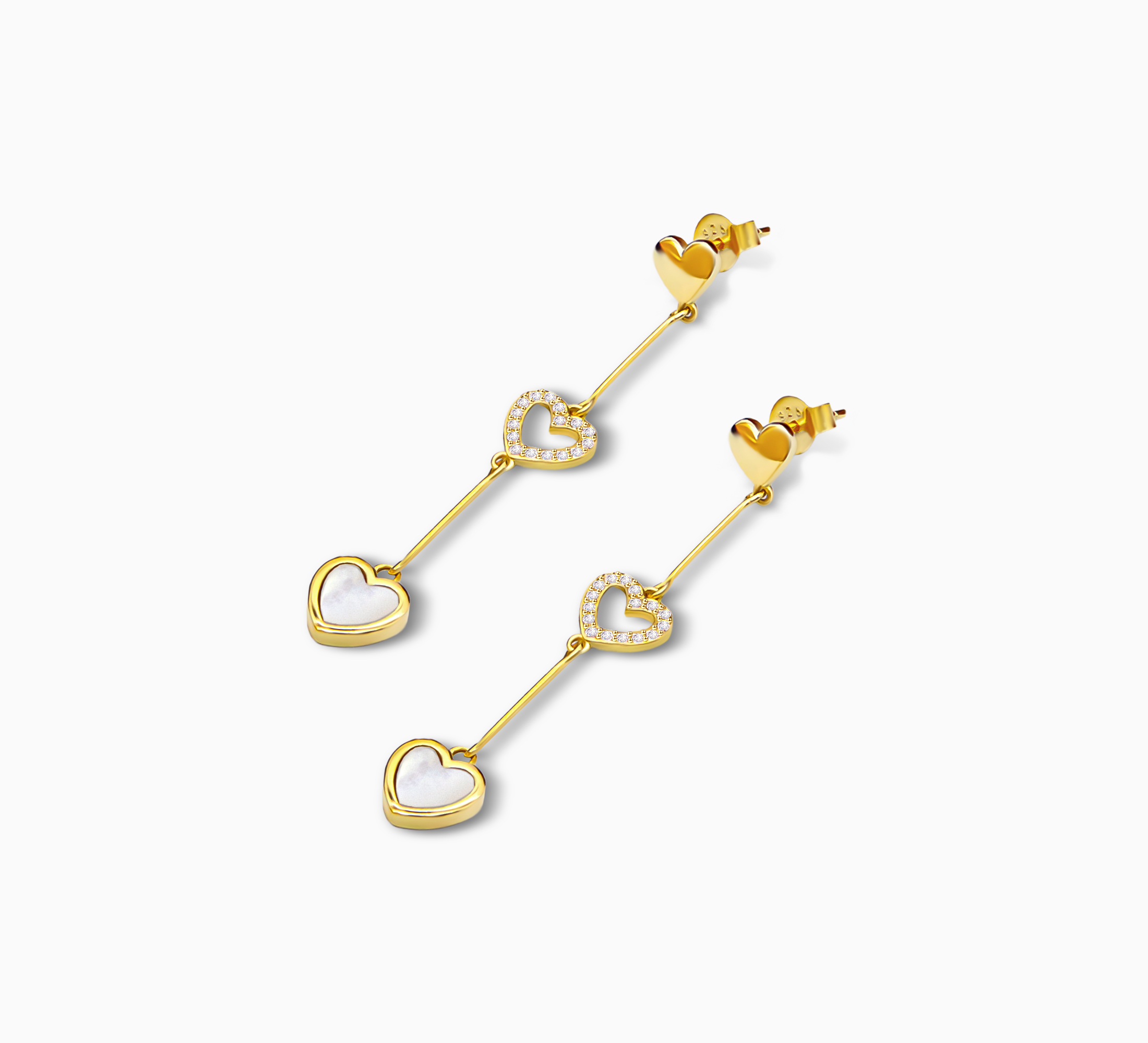The Radiant Hearts Earrings bring timeless romance to your jewellery collection. Crafted in 925 Sterling Silver and finished in gold plating, these earrings feature two open hearts with pave cubic zirconia and a luminous mother of pearl heart charm. Lightweight and graceful in movement, they’re perfect for special occasions, gifts or everyday elegance.