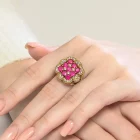 Regalia Bloom Ring encapsulates the essence of regal artistry with a stunning cluster of radiant pink zirconia embraced by halos of white zirconia and gold-beaded filigree. A tribute to botanical majesty and antique opulence.
