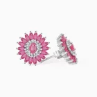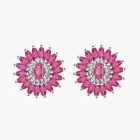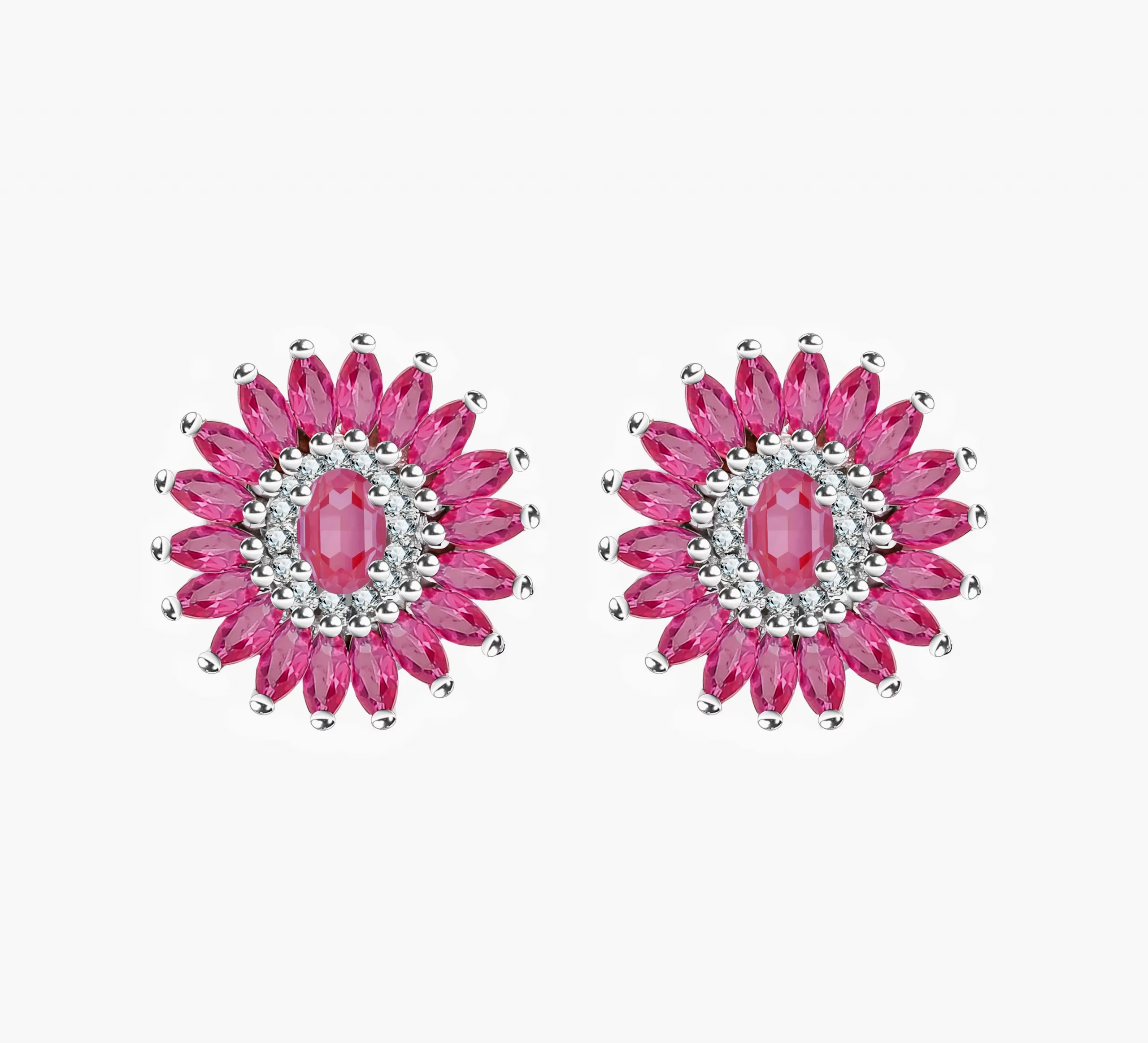 Unleash color with the Rosette Blaze Stud Earrings, where sculpted brilliance meets unapologetic beauty. Featuring a vibrant oval cut red center stone, each earring blooms with layers of marquise shaped cubic zirconia petals in radiant fuchsia tones. A ring of clear pave stones outlines the centerpiece, adding texture and contrast to this high impact floral silhouette.