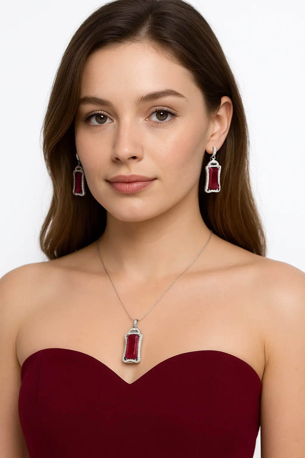 The Rubria Cartouche Pendant Set evokes couture grandeur in a modern silhouette. Handcrafted in 925 sterling silver, elongated ruby red cabochons rest within sculpted cartouche frames, creating a refined play of colour and light. Luxury sterling silver jewelry for women seeking a bold, heirloom worthy Pendant and earring set with exquisite finish and unforgettable presence.