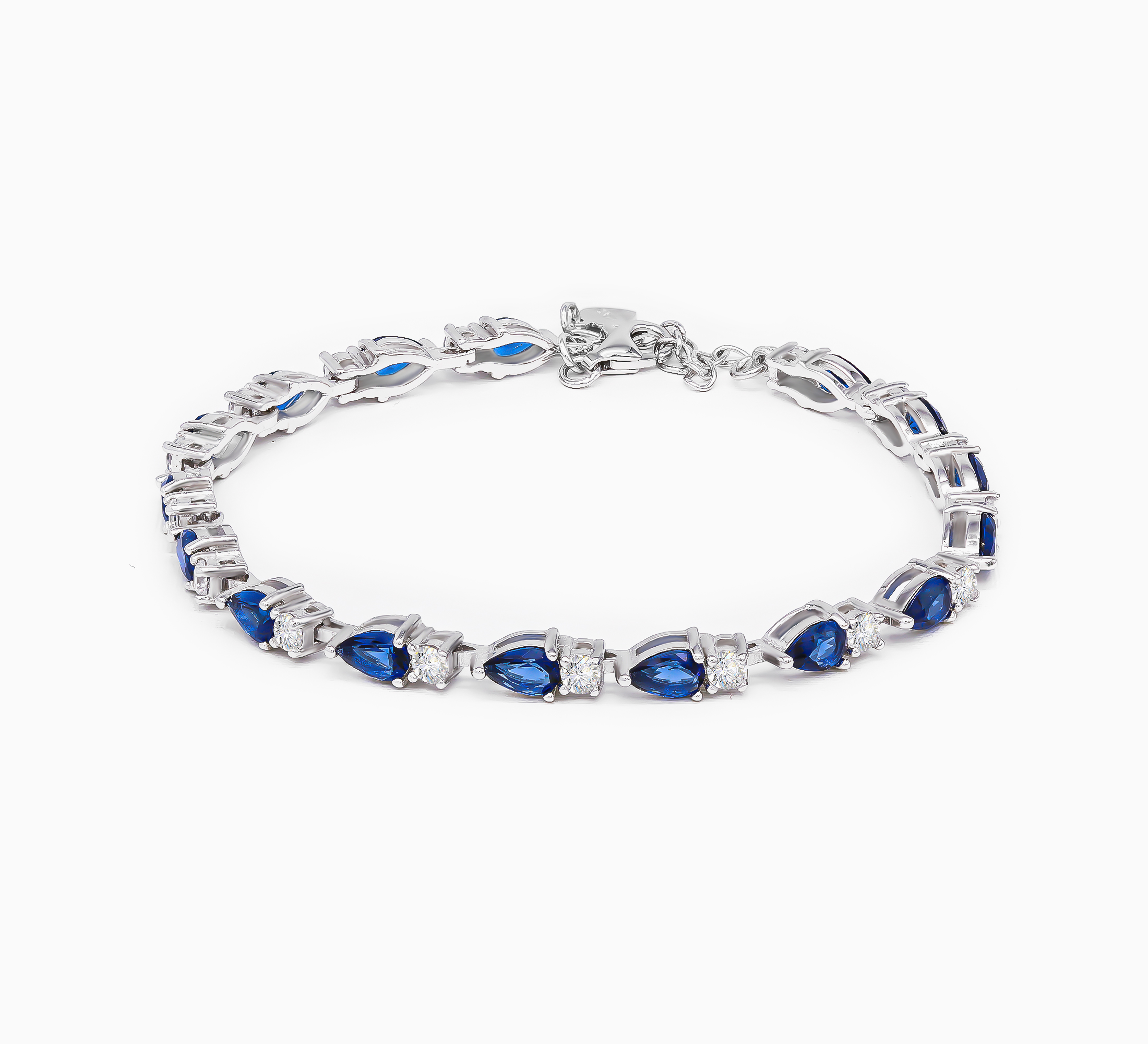 Unleash your inner royalty with the Sapphire Reign Bracelet. Crafted in luminous sterling silver, this bracelet showcases rich sapphire blue pear cut cubic zirconia, gracefully interspersed with shimmering white stones. Every detail reflects timeless sophistication with a modern edge. Whether worn for an evening gala or a powerful day look, it’s a piece that whispers elegance and speaks confidence.