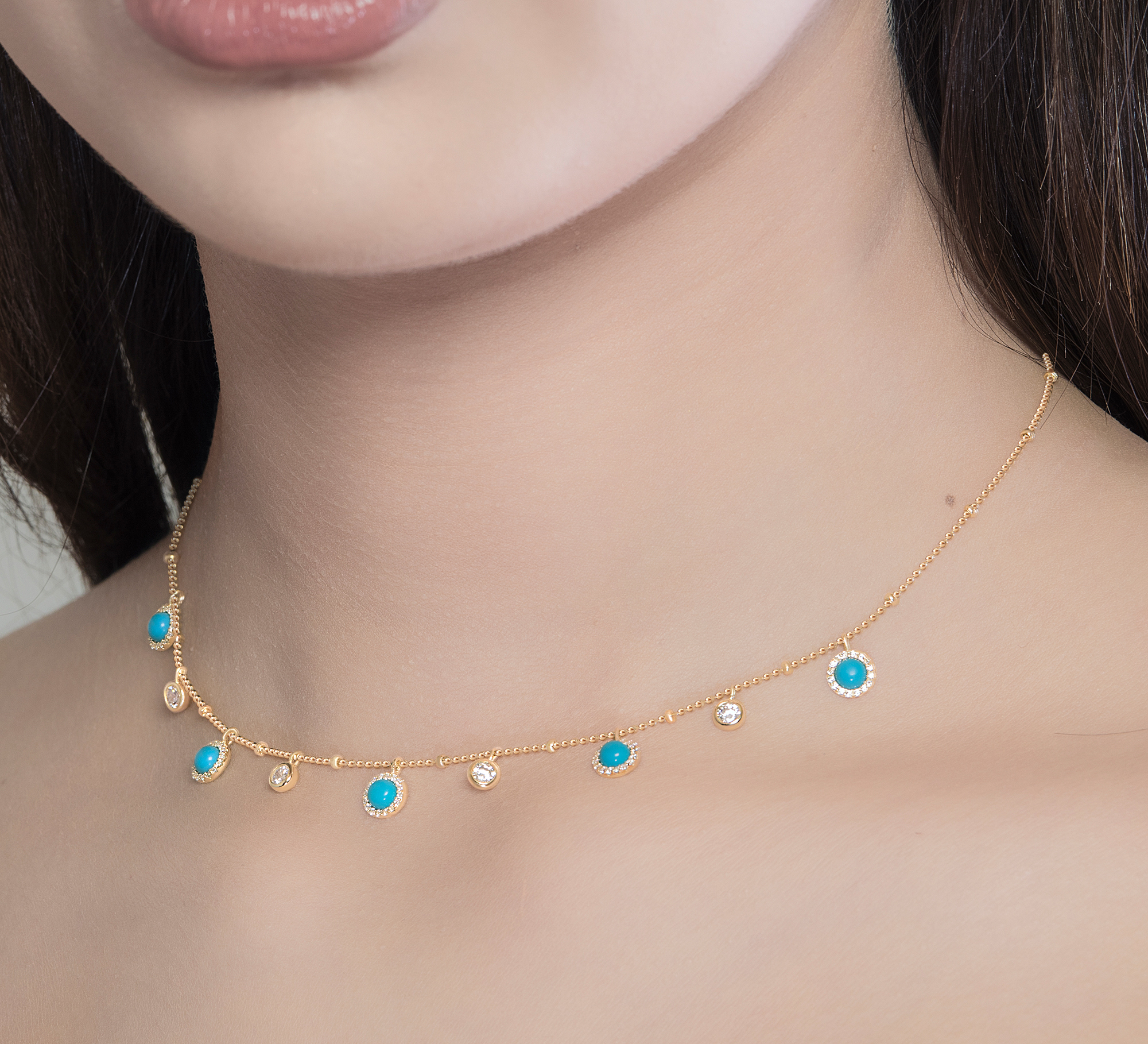 The Soleil Droplet Necklace glows with radiant charm, crafted in gold plated sterling silver and adorned with turquoise cabochons encircled in pave halos. Brilliant cut crystal stations add luminous contrast, evoking sunlight dancing across clear waters. A playful yet refined statement, it is perfect for layering or wearing alone as a touch of golden elegance.
