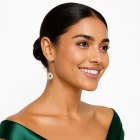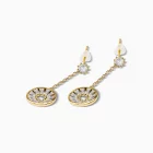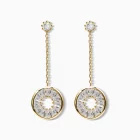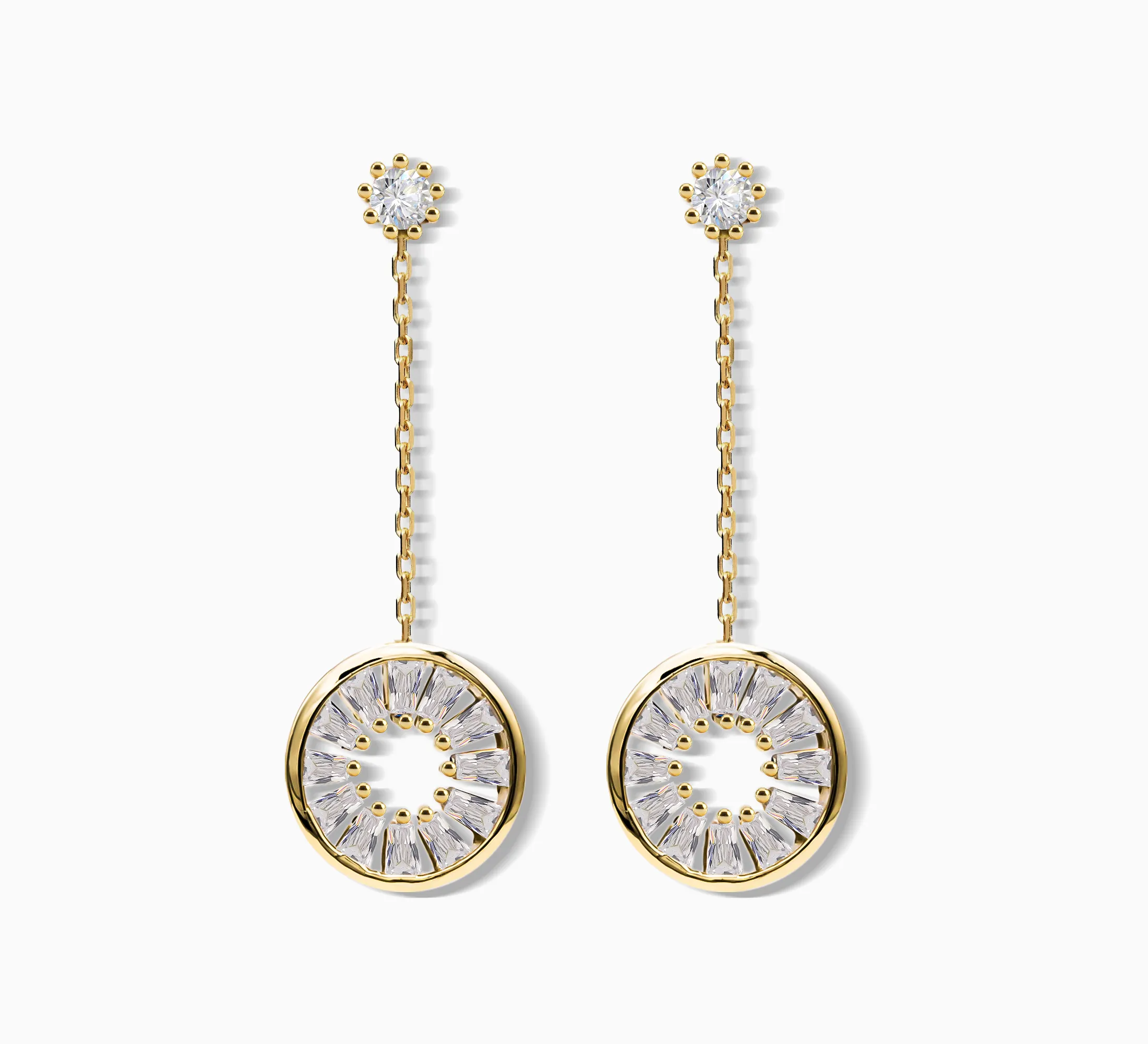 Drape your ears in cosmic brilliance with the Solstice Halo Earrings, where timeless allure meets contemporary minimalism. Suspended from delicate gold toned chains, the circular halos glisten with tapered baguette cut cubic zirconia, expertly set to mimic the ethereal glow of a radiant sunburst.