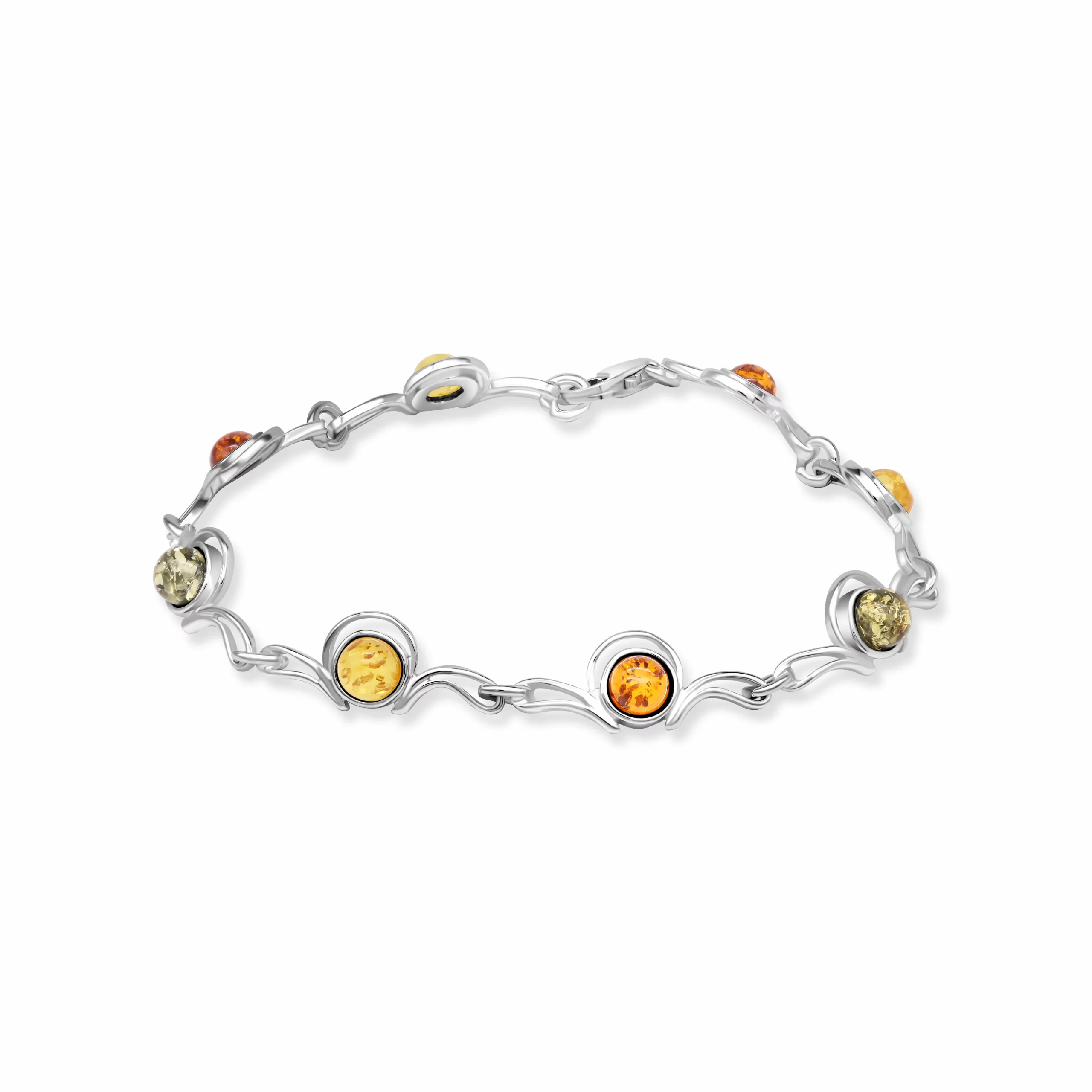 Inspired by sunlight dancing through forest vines, the Solvinea Amber Bracelet flows with nature’s rhythm. Handcrafted in 925 sterling silver, each wave shaped link cradles a genuine round amber stone glowing in tones of golden honey, rich cognac and mossy green. Elegant yet earthy, it’s a versatile treasure for free spirits, old souls and lovers of natural light.
