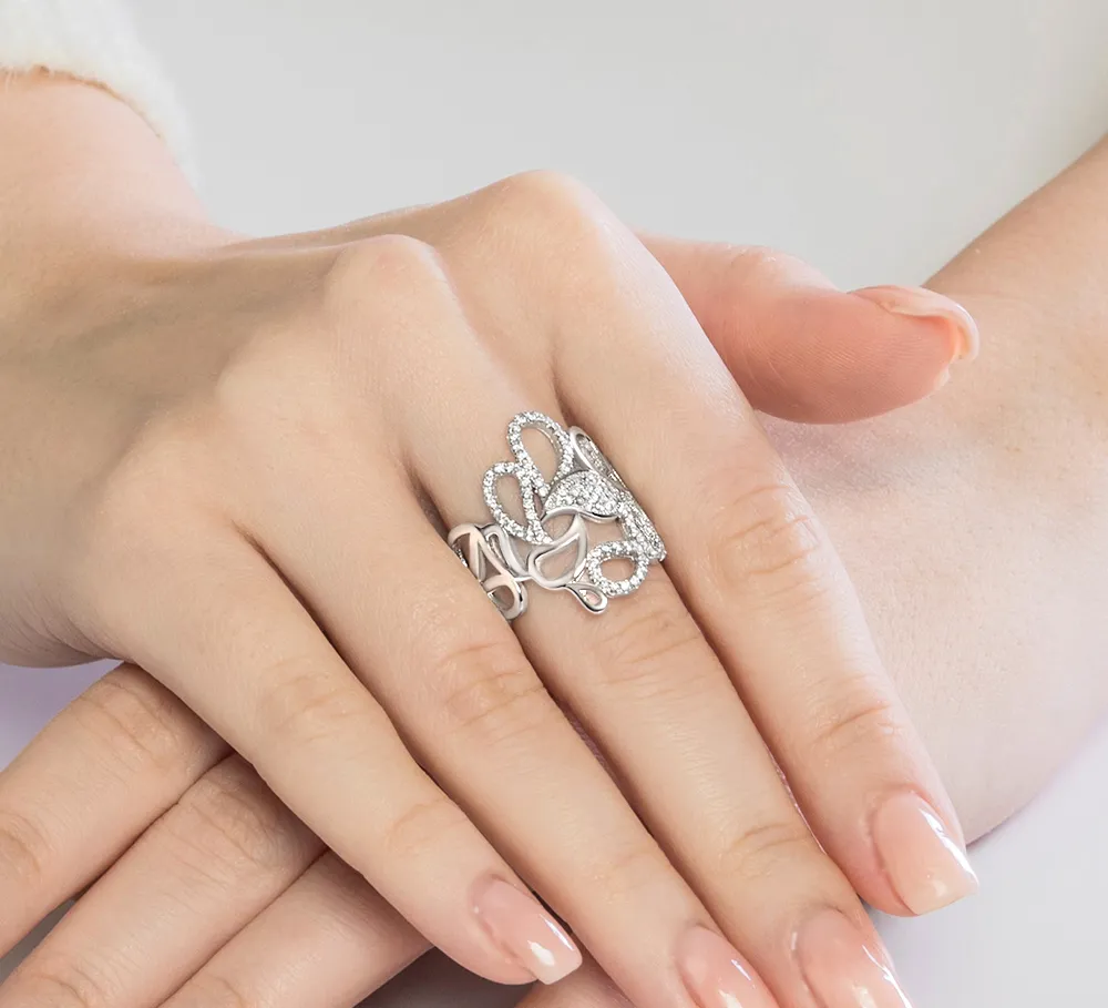 The Sylphine Arabesque Ring evokes ethereal elegance with its intricate, flowing design. Sculpted in polished sterling silver, the openwork pattern weaves delicate curves adorned with brilliant clear stones, creating a shimmering tapestry of light and shadow.