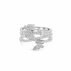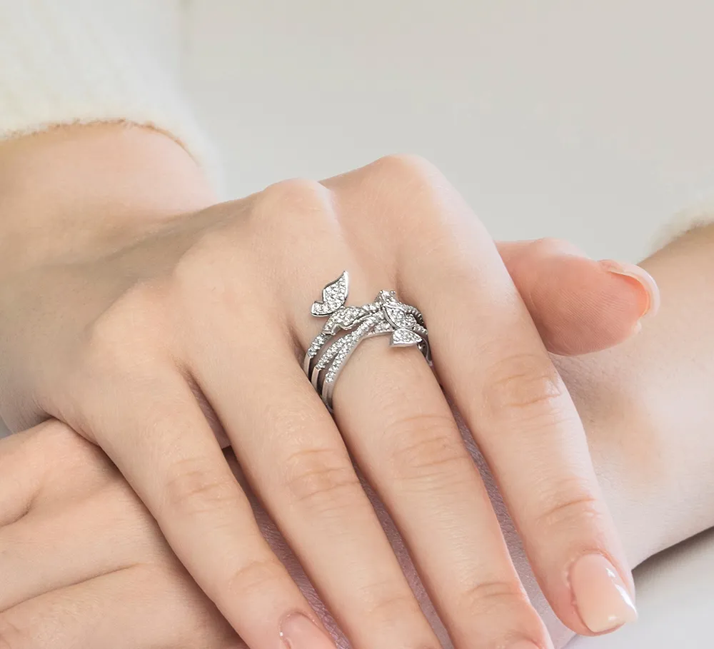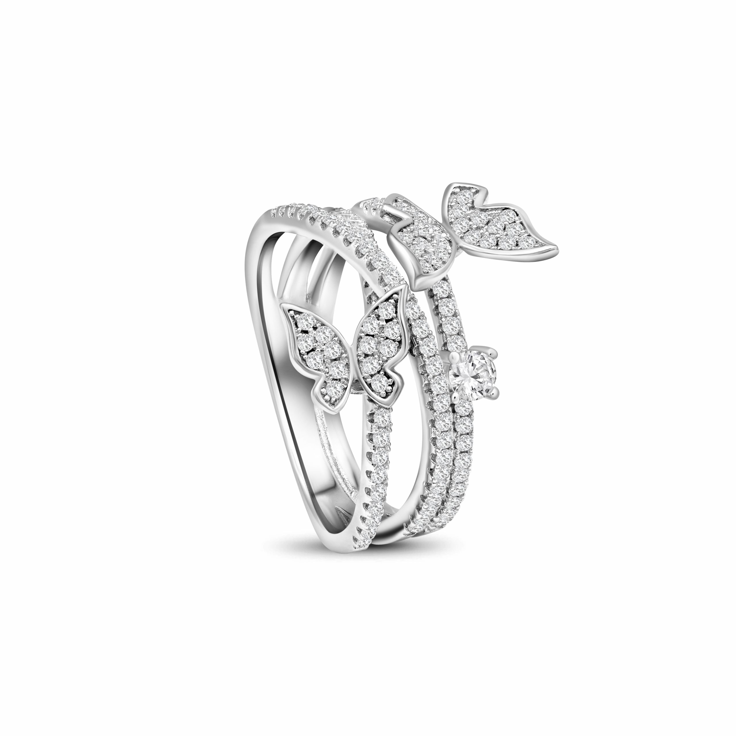 The Sylvara Flight Ring captures the delicate power of metamorphosis. Crafted in polished sterling silver, this multi band statement ring features glistening pave set cubic zirconia and intricately sculpted butterfly forms in mid flight. Layered yet seamless, it wraps the finger in light and movement, an elevated expression of femininity, transformation and free spirited elegance.