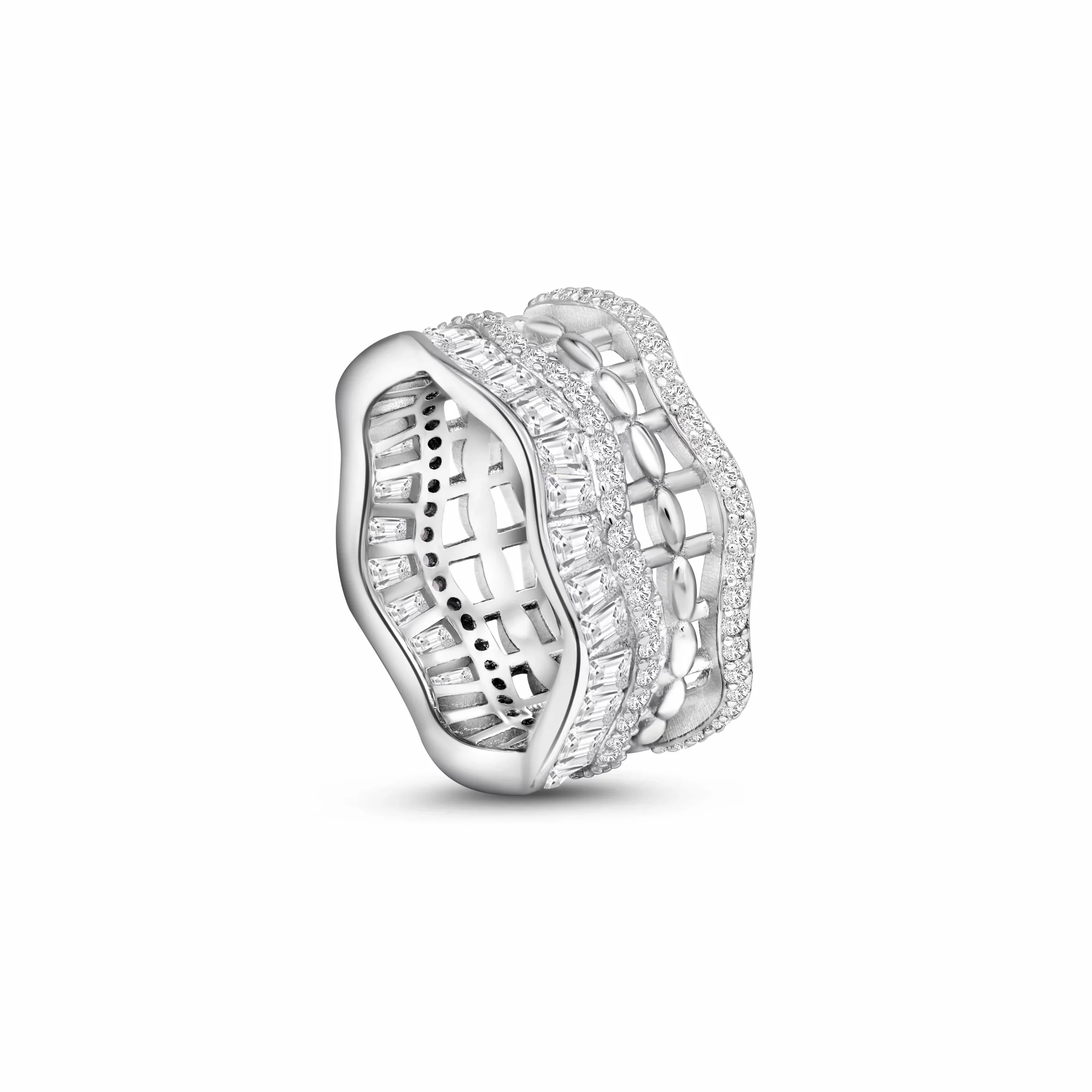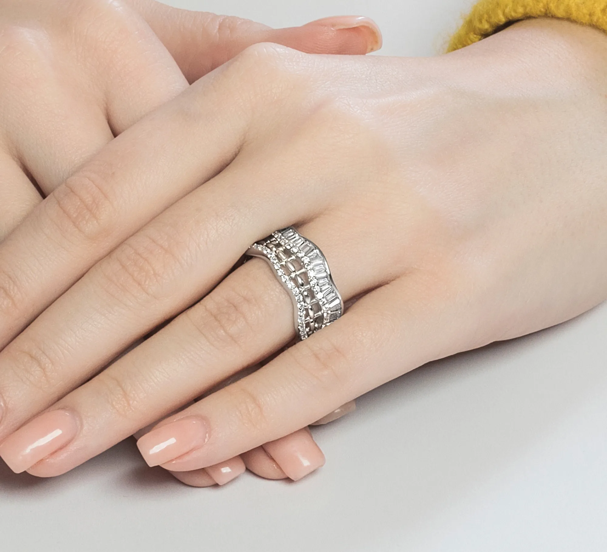 Dive into opulence with the TideLuxe Cascade Ring, a sculptural masterpiece featuring three seamlessly conjoined bands. With a graceful undulating silhouette, each row showcases distinct cuts, baguette, marquise and round cubic zirconia, brilliantly aligned to mimic flowing tides of sparkle. Designed to turn heads, this ring captures fluid motion and modern grandeur in a wearable art form.
