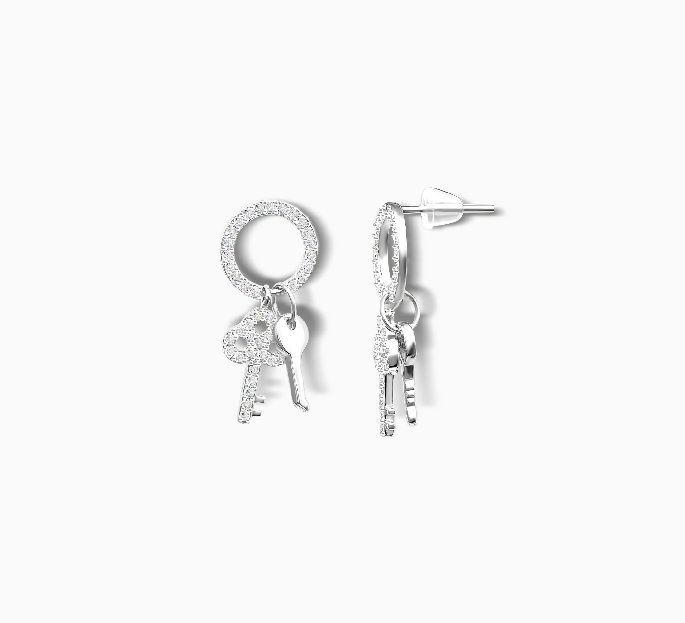 The Unlock My Heart Earrings capture the magic of moments that matter. Crafted in 925 Sterling Silver, these hoop earrings feature two petite key charms, one with dazzling pave cubic zirconia, the other smooth and polished. Suspended from a cubic zirconia encrusted circle, they move gracefully with every step.