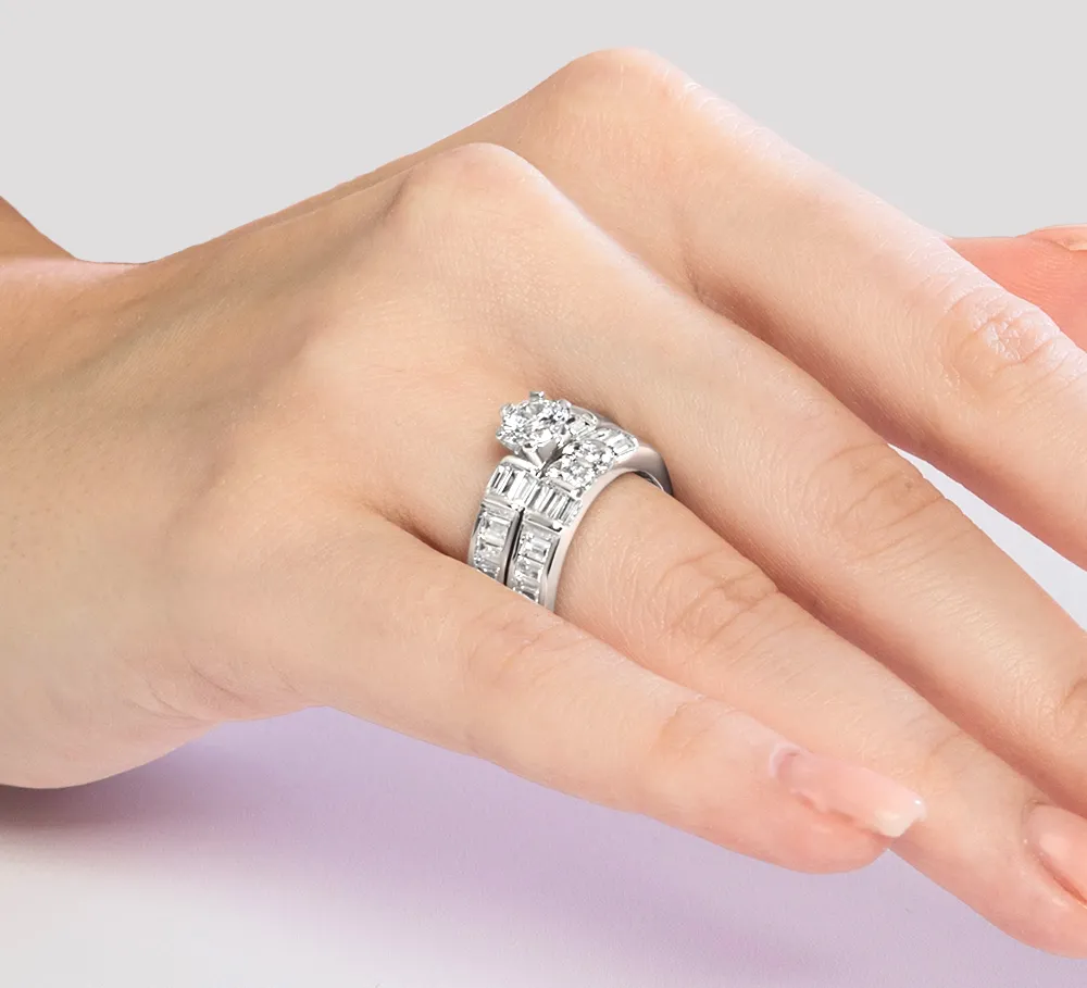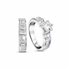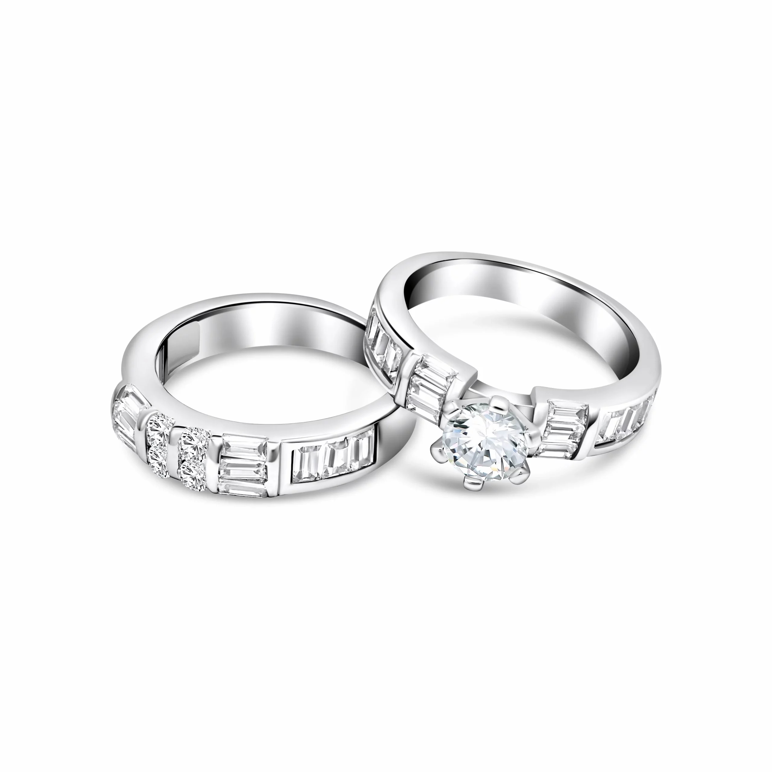 The Valoria Bridal Set is a modern celebration of love and refined elegance. Crafted in hallmarked 925 sterling silver, it features a brilliant round cut cubic zirconia solitaire paired with a matching band, both adorned with precision set baguette and round cut stones for sleek, architectural sparkle.