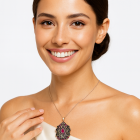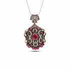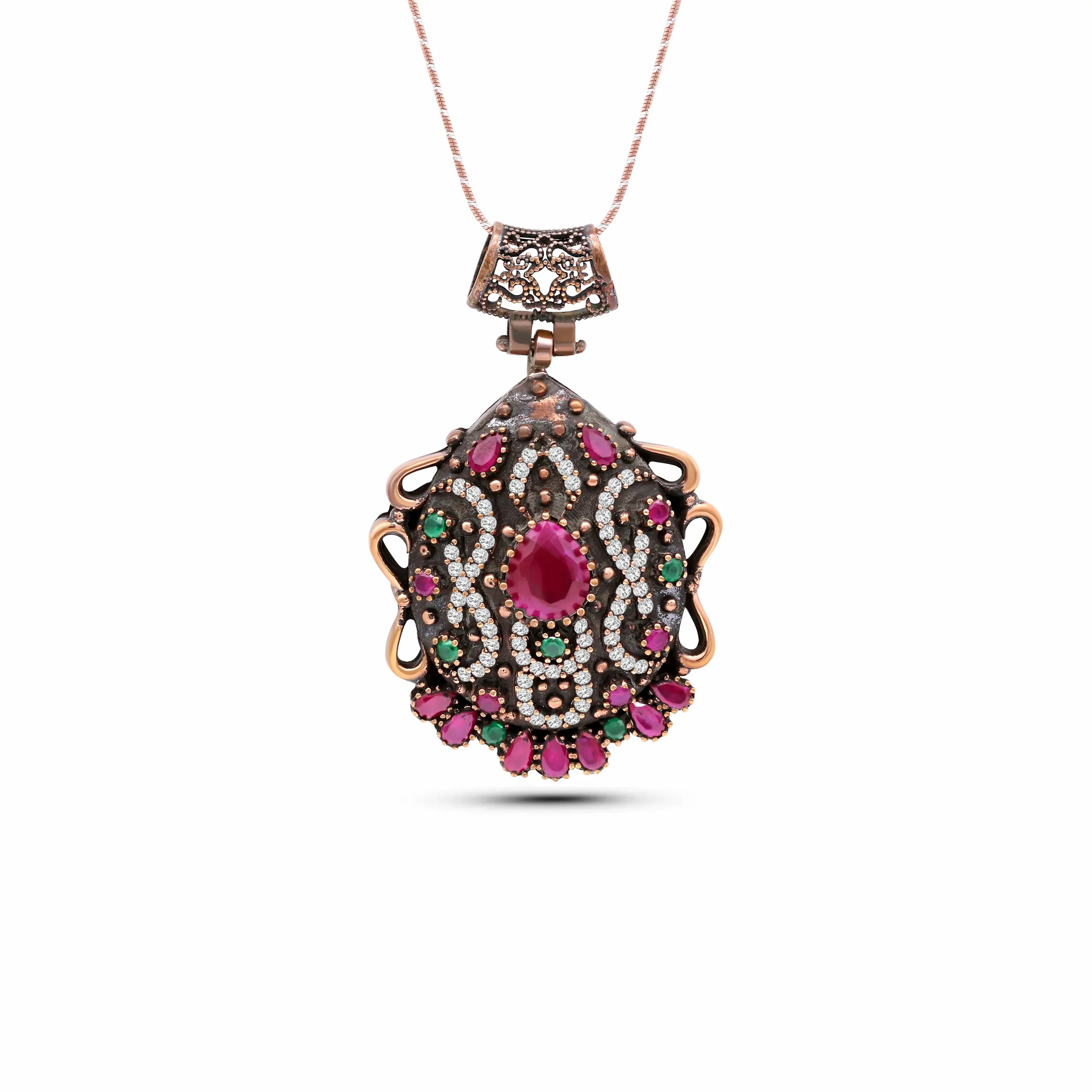 Step into the grandeur of a bygone era with the Velouria Royale Heritage Pendant, a regal masterpiece echoing the opulence of palace jewels. Crafted in a vintage inspired oxidised rose gold finish, this pendant flaunts a mesmerising central ruby red teardrop stone, embraced by intricate scrollwork adorned with green, pink and brilliant white accents.
