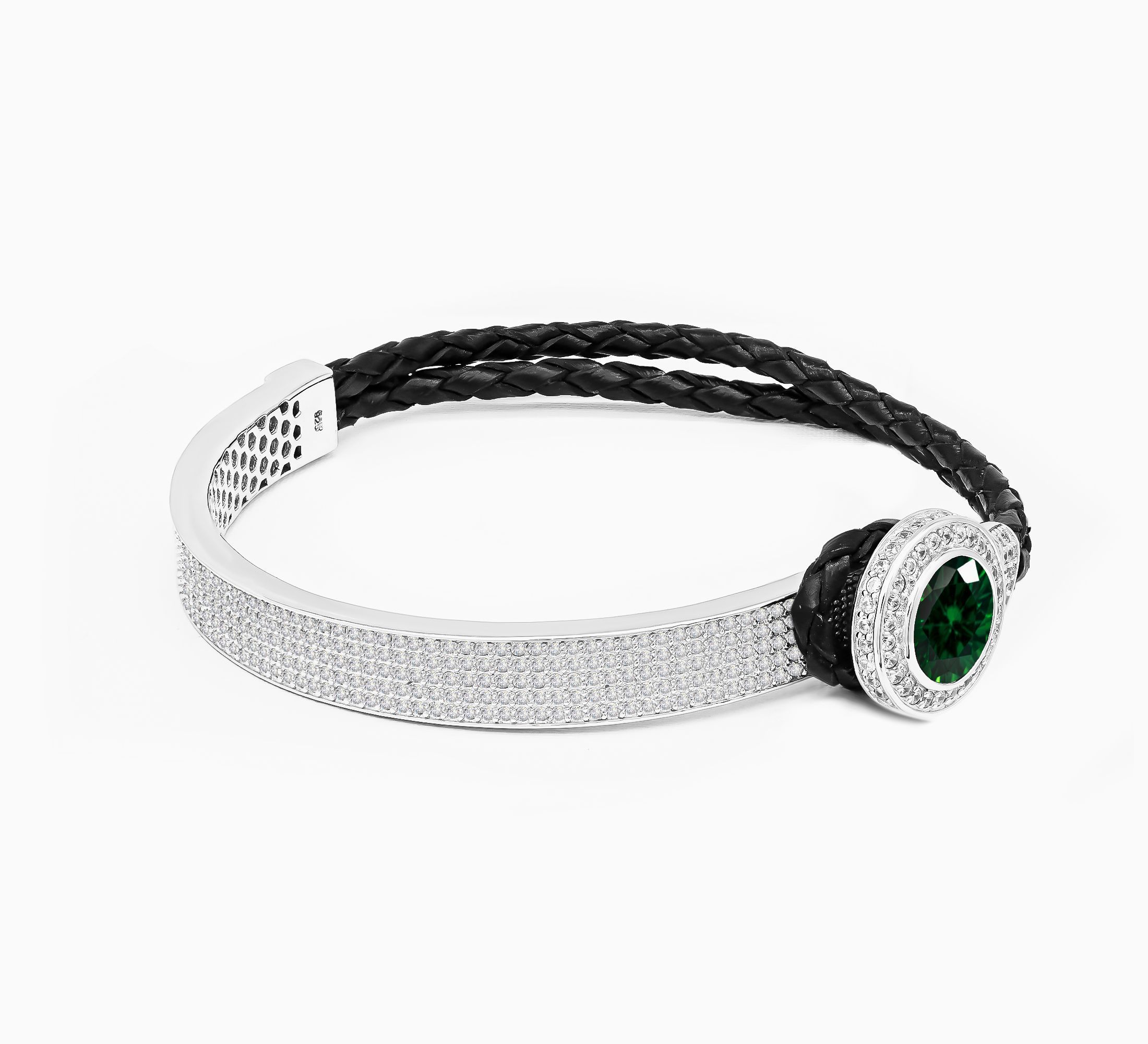 Bold yet refined, the Verdant Sovereign Bracelet exudes regal confidence. A deep emerald hued cabochon rests in a pave halo, crowned on a sterling silver cuff layered with radiant crystal cubic zirconia detailing. Dual braided leather strands add modern contrast, offering texture and strength.